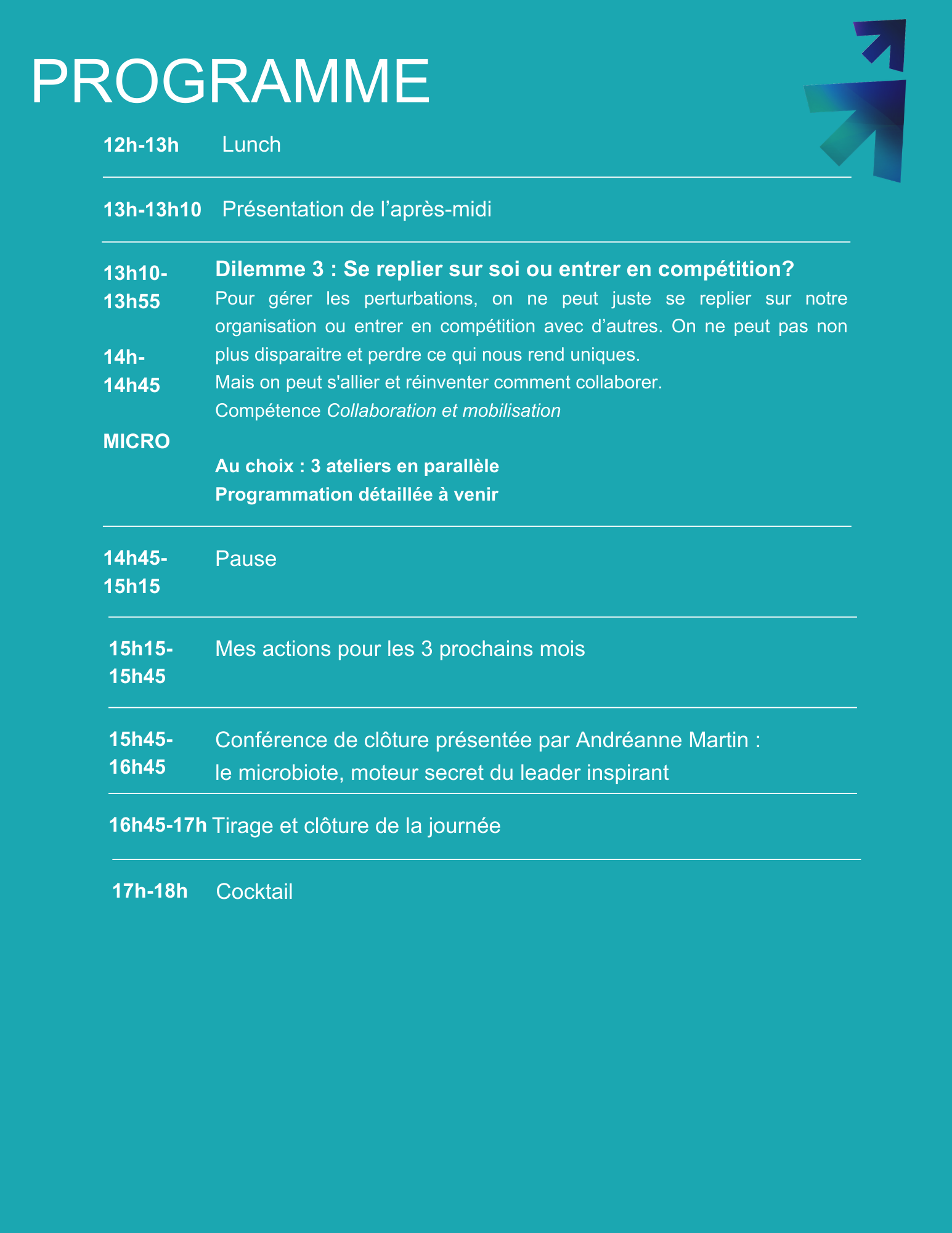 Au fil de la journée, vous naviguerez du macro au micro, de votre macrosystème à votre microbiote, en passant par les cinq compétences essentielles :